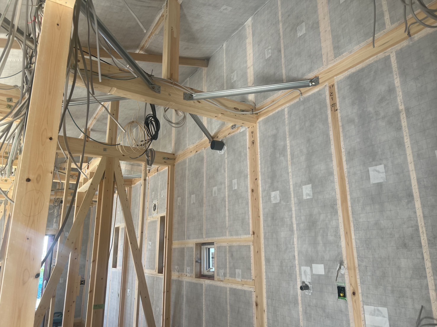 透湿性のあるポリエステルの専用不織布シートを張りこの中にセルロースファイバーを吹き込んでいきます。